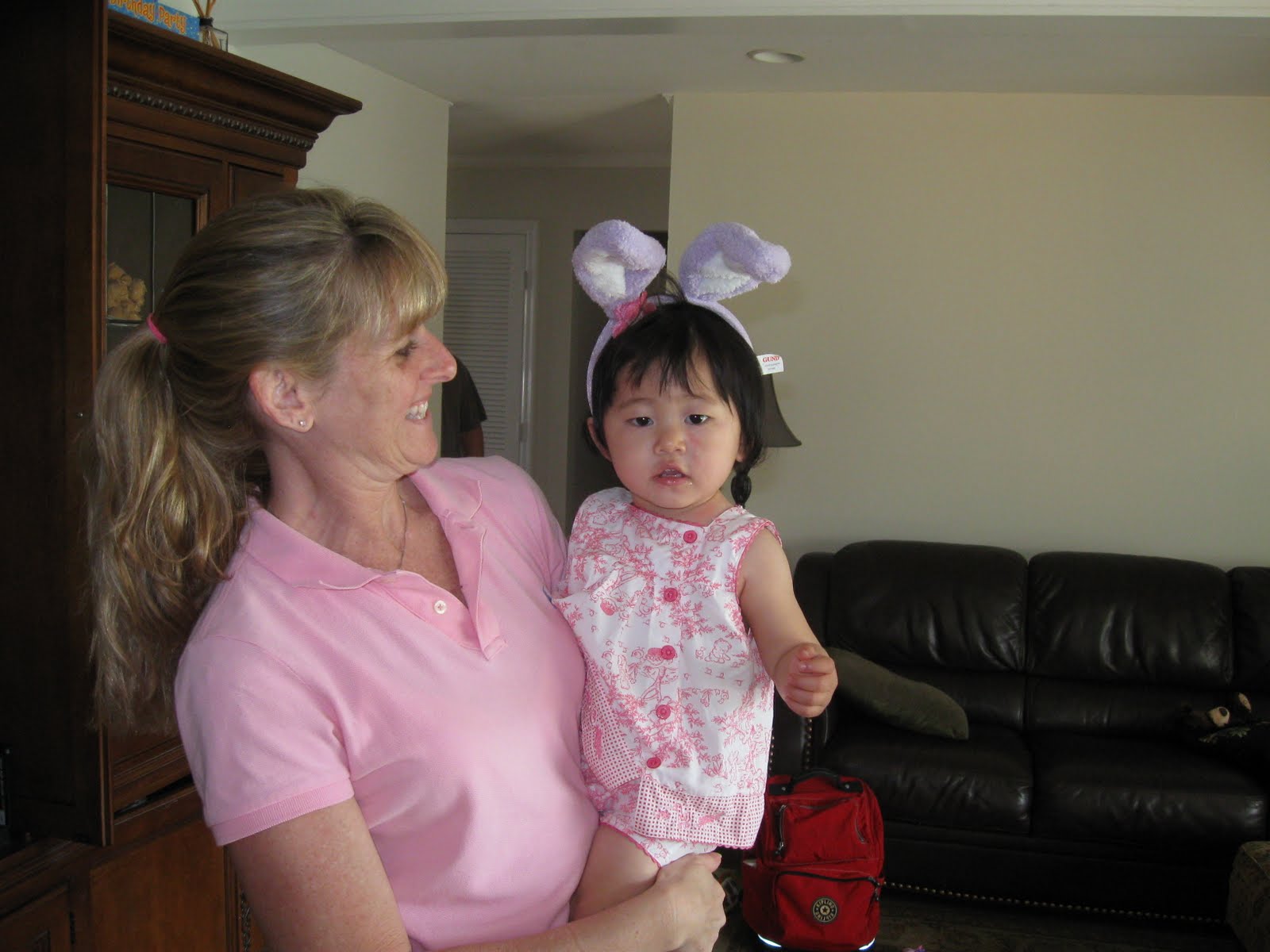 Off to the Easter Egg Hunt with Mom, Tracy and Grace (in the back)